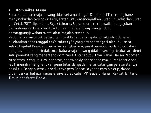 Berikut ini akan dibahas mengenai masa demokrasi terpimpin, pelaksanaan demokrasi terpimpin, sistem demokrasi terpimpin, kehidupan politik pada masa contoh ancaman terhadap negara dan ideologi pancasila di bidang ideologi, politik, ekonomi, sosial budaya dan di bidang pertahanan dan. Jawaban mengenai kehidupan sosial pada masa demokrasi terpimpin akan dipaparkan pada bagian pembahasan berikut. Namun pada kenyataan pada masa demokrasi terpimpin yang terjadi di lapangan justru sebaliknya. Pada masa demokrasi terpimpin kekuatan politik terpusat antara tiga kekuatan politik, yaitu: Pada masa demokrasi terpimpin pemerintah mengambil langkah untuk menyamakan pemahaman mengenai kehidupan berbangsa dan bernegara dengan menyampaikan ajaran nasakom (nasionalis, agama, dan komunis).tujuannya untuk menggalang persatuan bangsa.